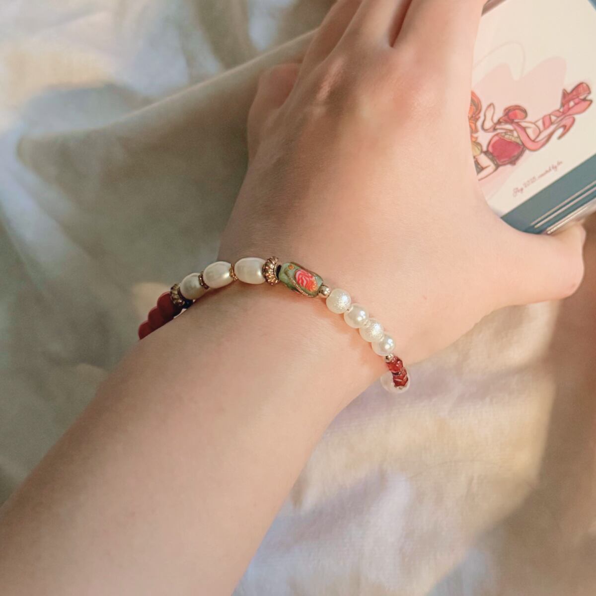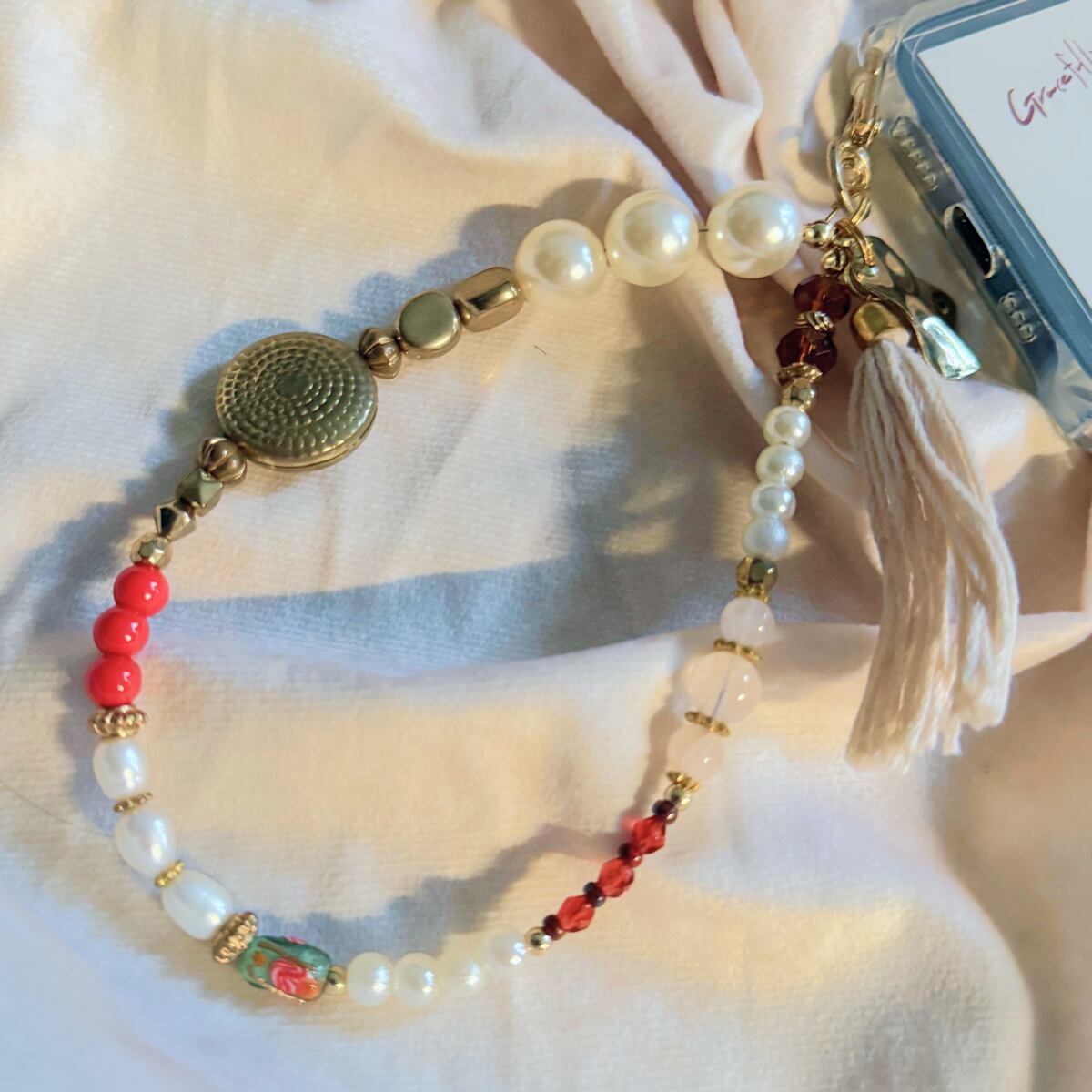 素材:ローズクォーツ・淡水パール・アクリルビーズ・メタルビーズ